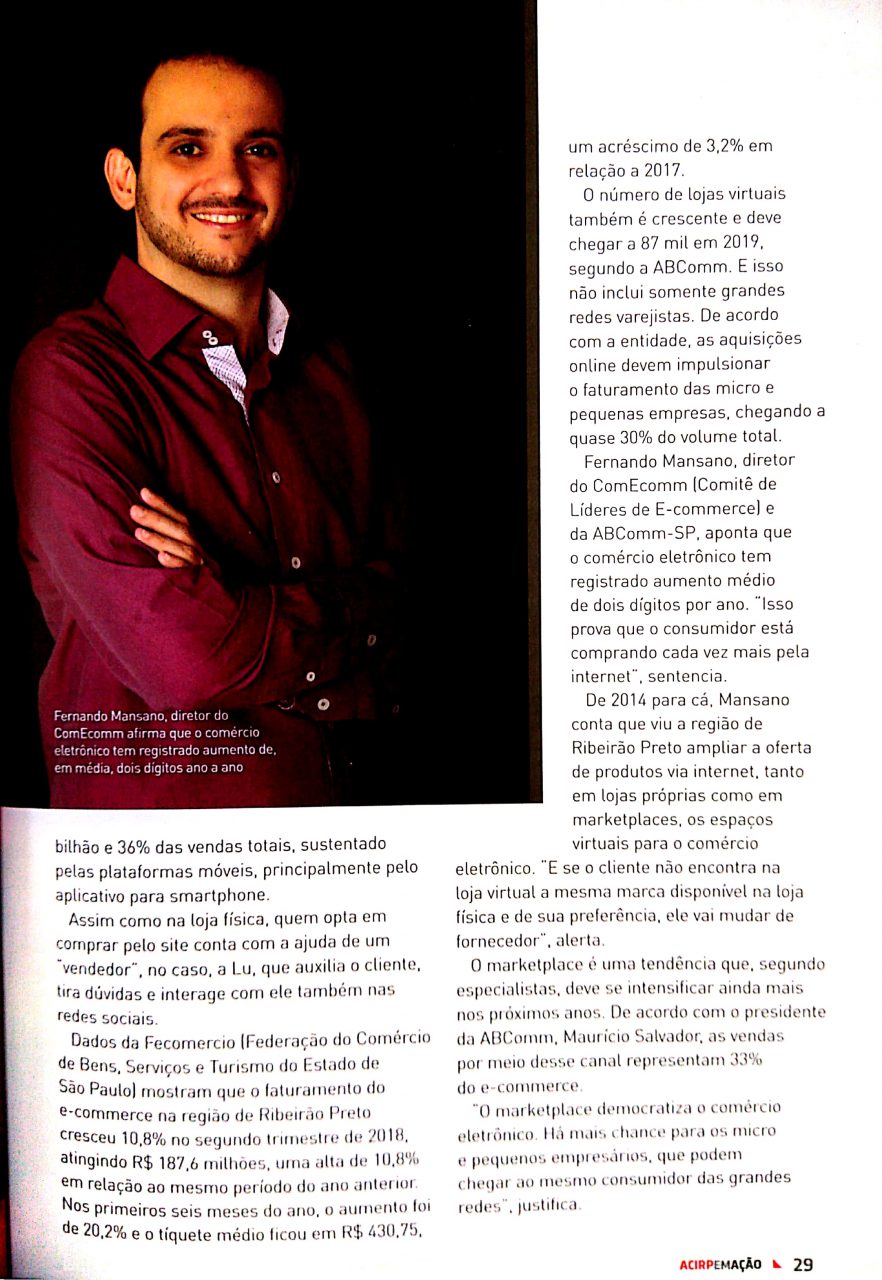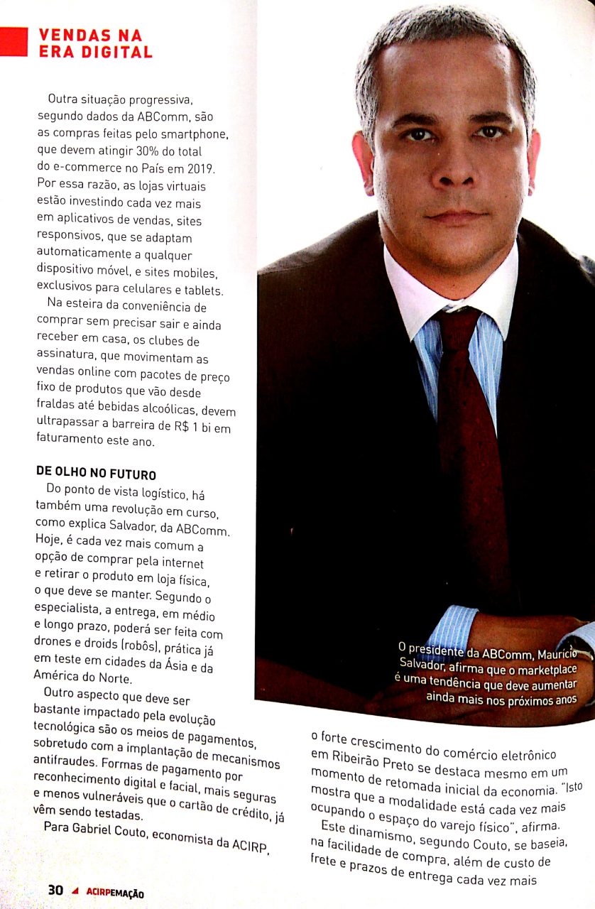 Na edição 26 da Revista ACIRP em Ação da Associação Comercial e Industrial de Ribeirão Preto, para falar sobre as vendas online foram entrevistados Fernando Mansano, Fundador do ComEcomm (Comitê de Líderes de E-commerce) e Diretor SP da ABComm (Associação Brasileira de Comércio Eletrônico), e Maurício Salvador, Presidente da ABComm.